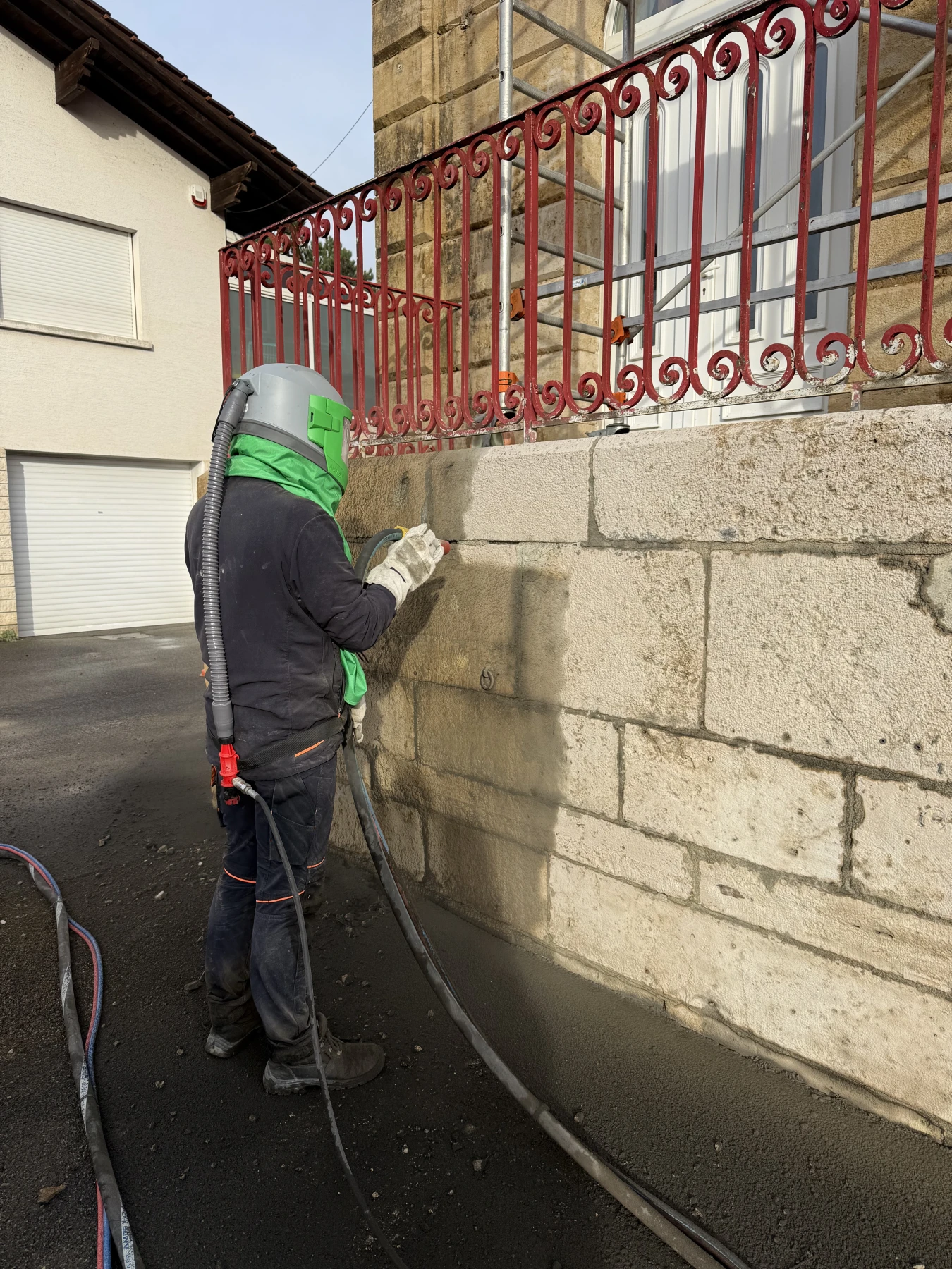 Comme le montrent les photos du chantier, le décapage par aérogommage a été réalisé directement sur site, avec :